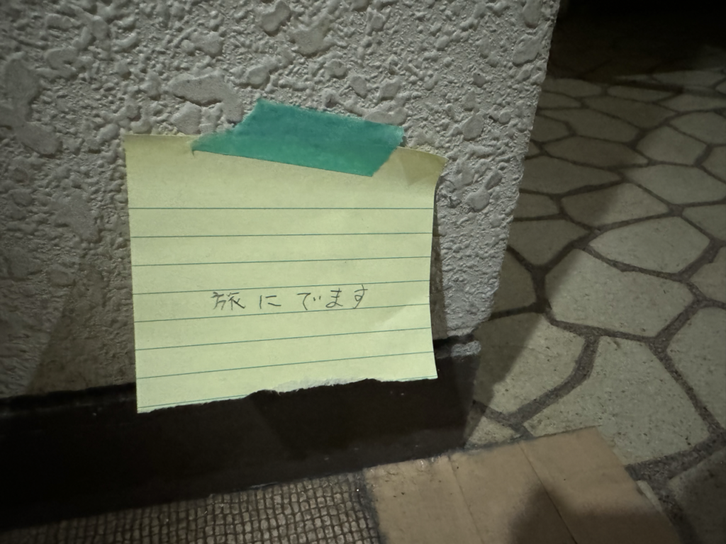 あれ、ここ11月にはクマのぬいぐるみがいたはずなのにいない!書き置きが貼ってある!