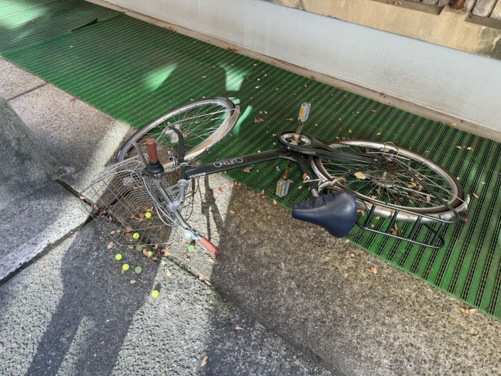 倒れた自転車のカゴに入っていたのがスーパーボールだ!??????