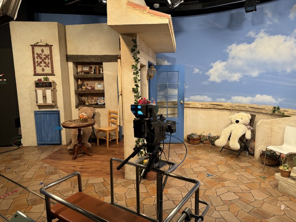 作るエリアとなっている3Fには常設スタジオが2種類あり、片方はブルーバック+ニュースセットのスタジオ。もう片方は小さめだが一面グリーンバッグになっているスタジオ。