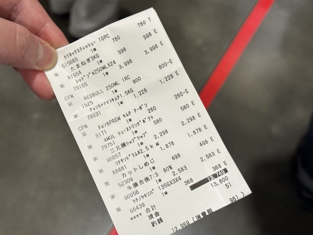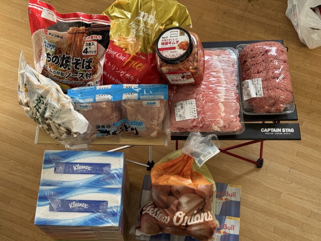 実際に買った内容を見ると「冷凍前提」や「長持ちするもの」がメイン。日用品はお買い得なティッシュボックスやお好きなレッドブル。
